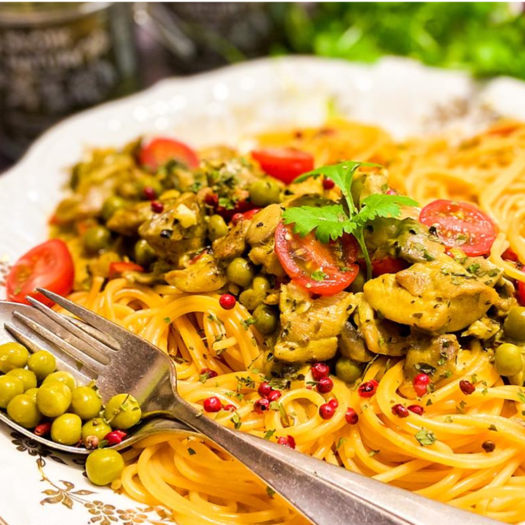 Przepisy 24-09-2025 Makaron z groszkiem i kurczakiem w kremowym sosie
