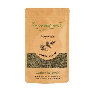 Cząber suszony od Kujawskich Ziół pakowany jest w poręczną torebkę typu doypack z zamknięciem ZIP, która:
