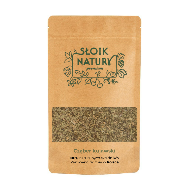 Cząber pakujemy w praktyczną torebkę z zamknięciem strunowym, która skutecznie chroni przyprawę przed wilgocią, światłem i utratą aromatu. Torebka jest wielokrotnego użytku – wystarczy szczelnie ją zamknąć po użyciu, aby przyprawa zachowała swoją świeżość na długo.