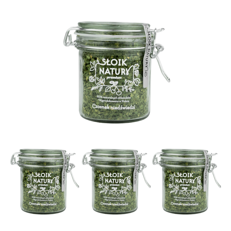 Produkt pakowany w szczelny szklany słoik z klamrą, który chroni czosnek niedźwiedzi przed wilgocią, światłem i utratą aromatu. Po otwarciu przechowuj w suchym i chłodnym miejscu.