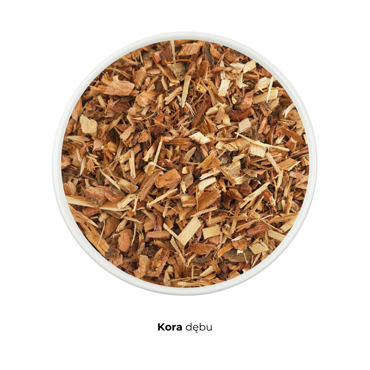 Kora dębu – silne działanie ściągające i przeciwzapalne, zmniejsza przepuszczalność błony śluzowej jelit.