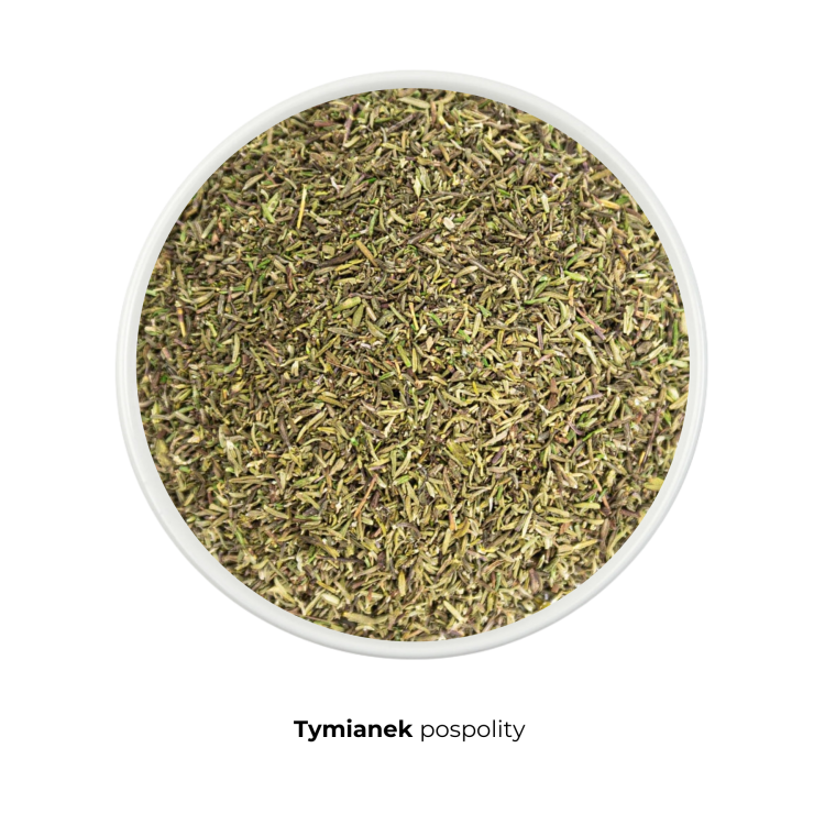 Tymianek (liść) – działa przeciwbakteryjnie, przeciwwirusowo i przeciwskurczowo, łagodzi stany zapalne jelit.