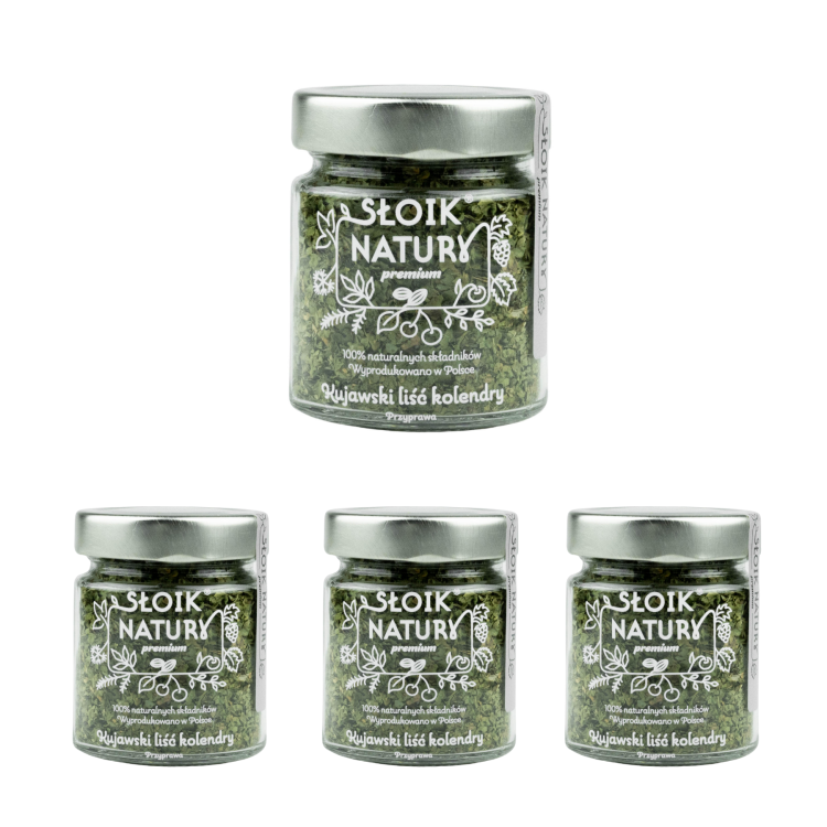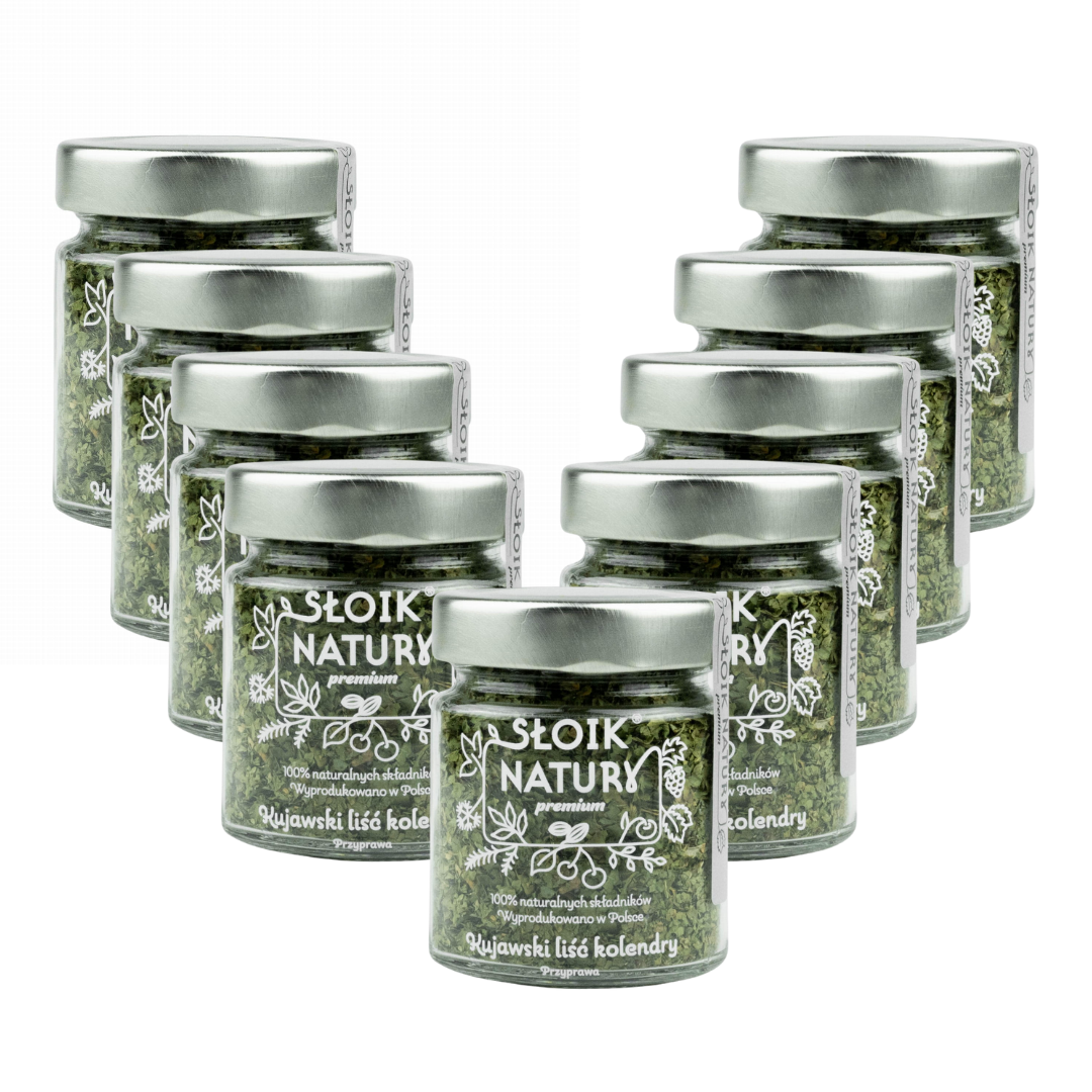 Liść kolendry pakujemy w szczelny szklany słoik o pojemności 20 g, który skutecznie chroni przyprawę przed wilgocią i utratą aromatu, a także pięknie prezentuje się w kuchni.