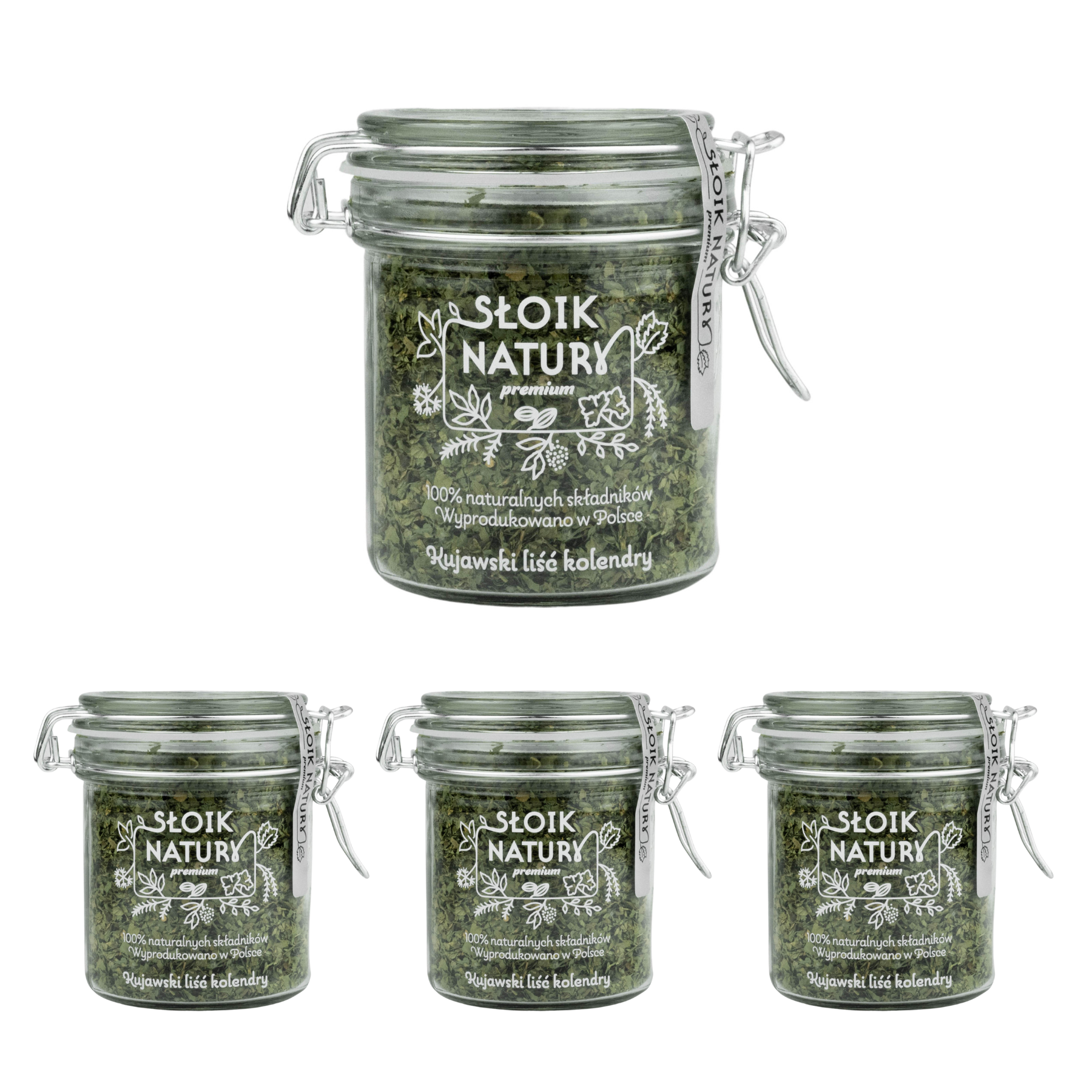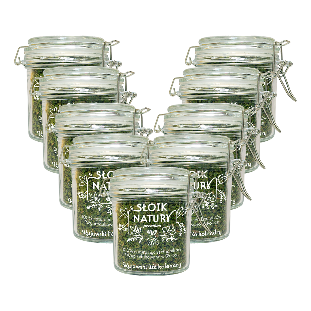 Liść kolendry pakujemy w szczelny szklany słoik o pojemności 50 g, który skutecznie chroni przyprawę przed wilgocią i utratą aromatu, a także pięknie prezentuje się w kuchni.