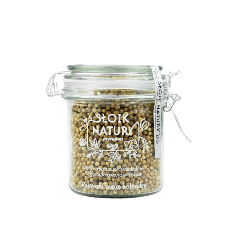 Owoce kolendry pakujemy w szczelne, szklane słoiki, które doskonale chronią aromat przyprawy przed wilgocią i utratą świeżości. Gdy przyprawa się skończy, możesz uzupełnić słoik ekologiczną torebką strunową z naszej oferty.
