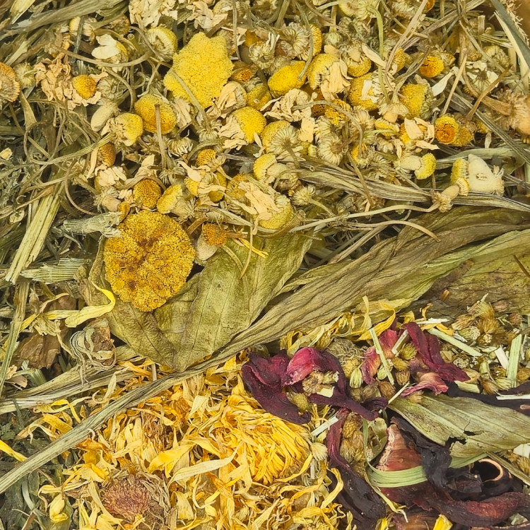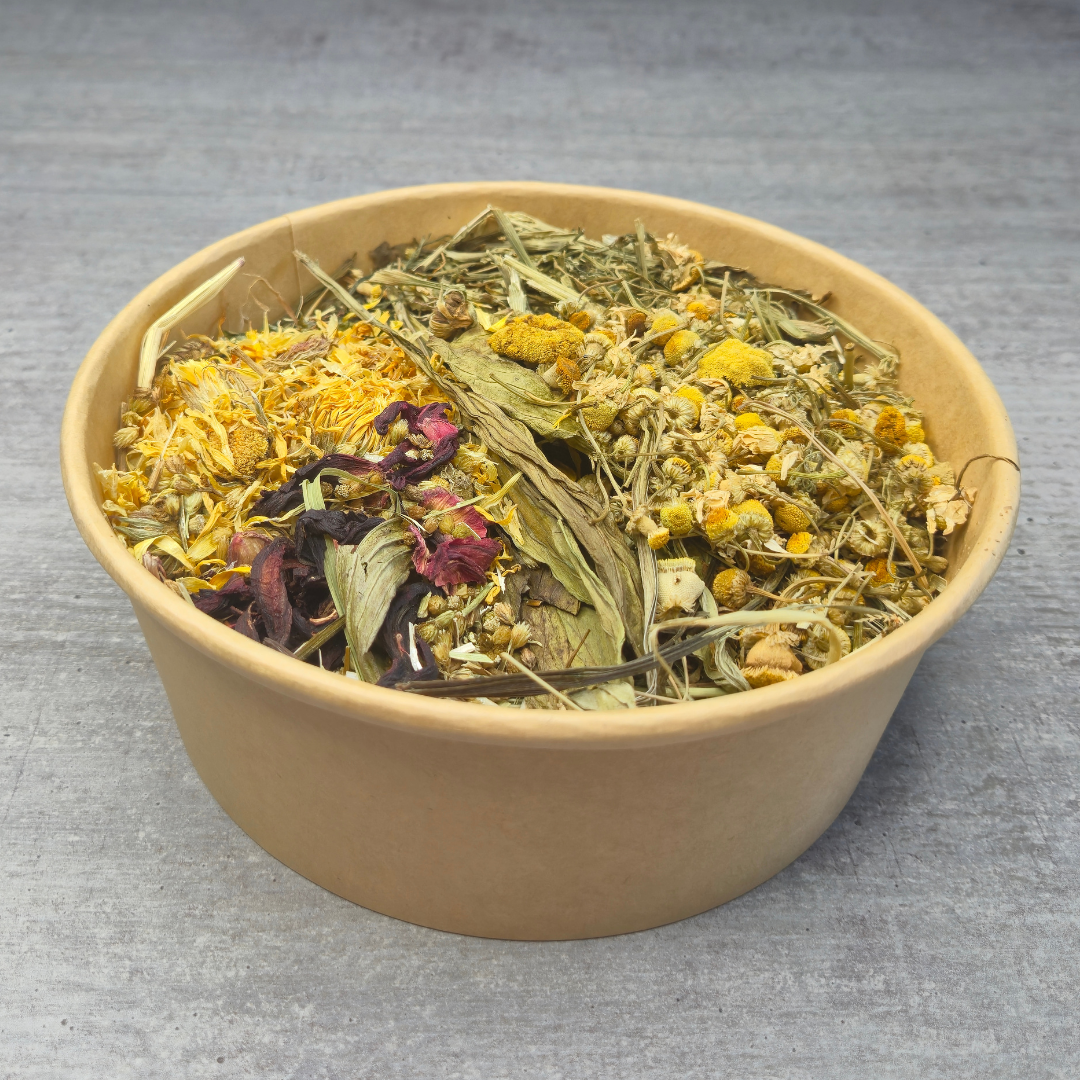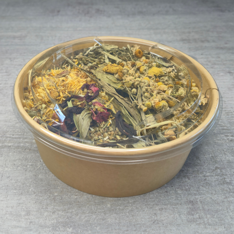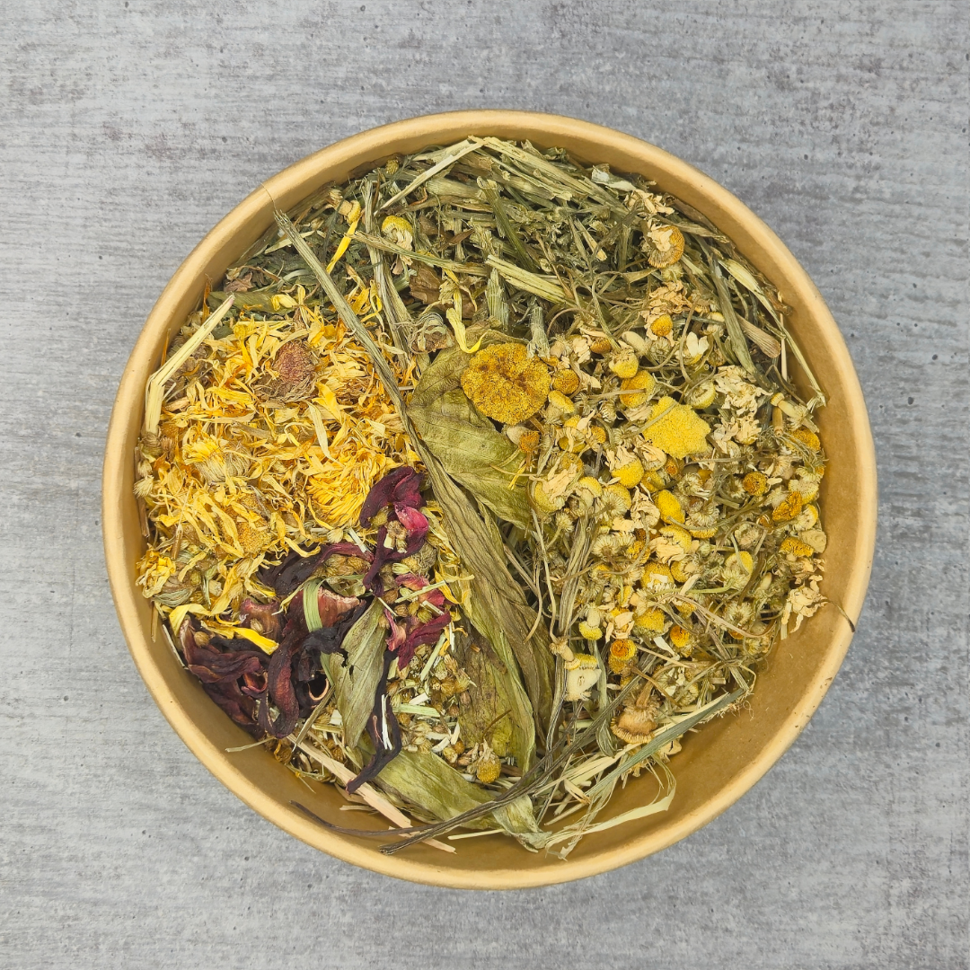 To połączenie starannie wyselekcjonowanych suszonych roślin, które nie tylko smakują zwierzakom, ale również łagodzą wzdęcia, wspomagają trawienie i poprawiają apetyt. Całość została zapakowana w ekologiczne opakowanie strunowe, które chroni aromat ziół i jest przyjazne dla środowiska.