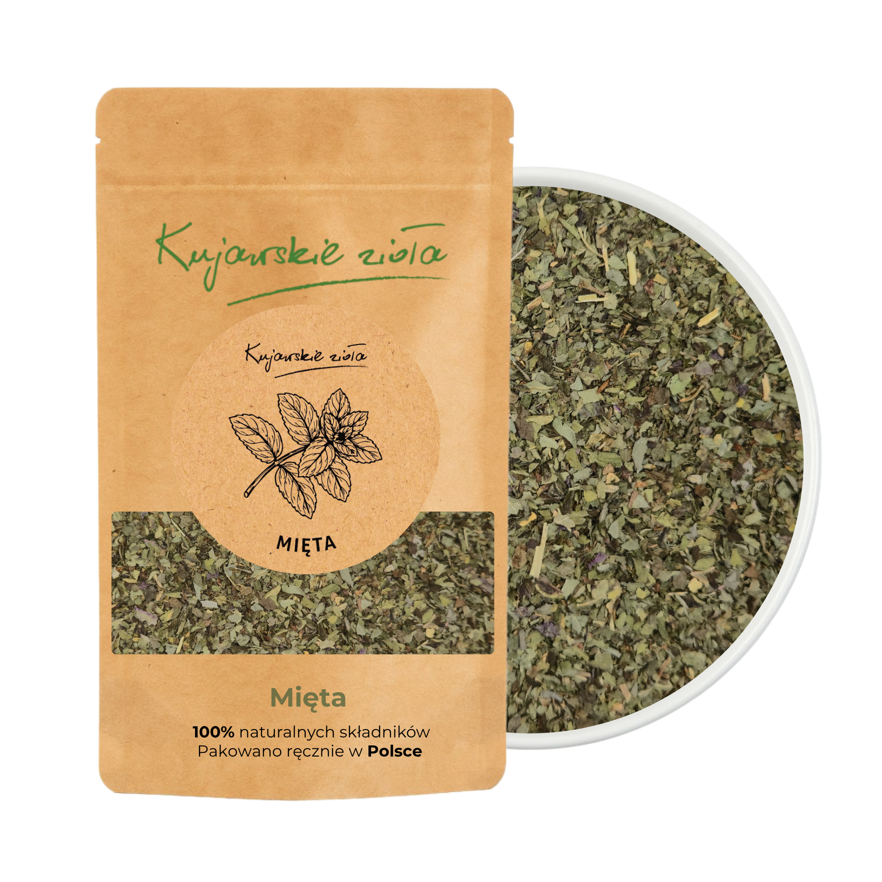 Aby zachować aromat i smak, Kujawskie Zioła pakują miętę w wygodną torebkę typu doypack z zamknięciem ZIP.
