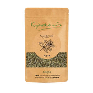 Aby zachować aromat i smak, Kujawskie Zioła pakują miętę w wygodną torebkę typu doypack z zamknięciem ZIP.
