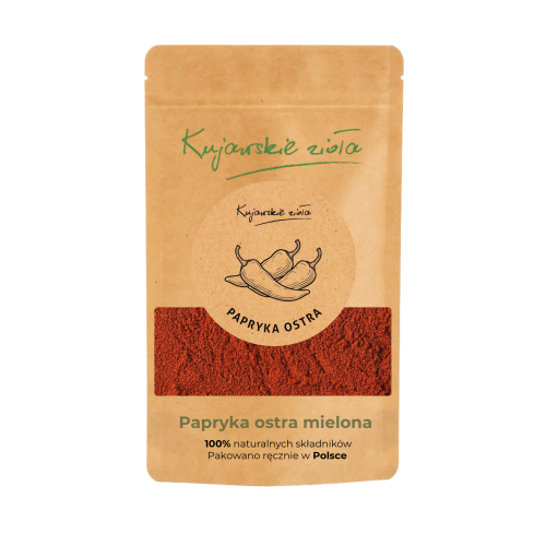 Papryka ostra mielona od Kujawskich Ziół pakowana jest w praktyczne opakowanie typu doypack z zamknięciem ZIP, które: