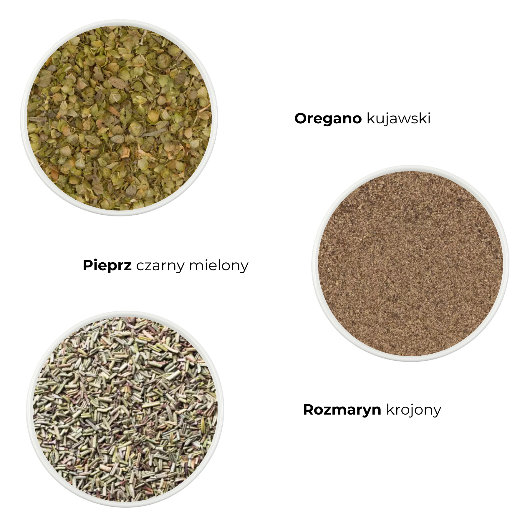 Składniki: pomidor suszony, papryka słodka, sól himalajska, bazylia, czosnek, tymianek, oregano, pieprz czarny, rozmaryn.