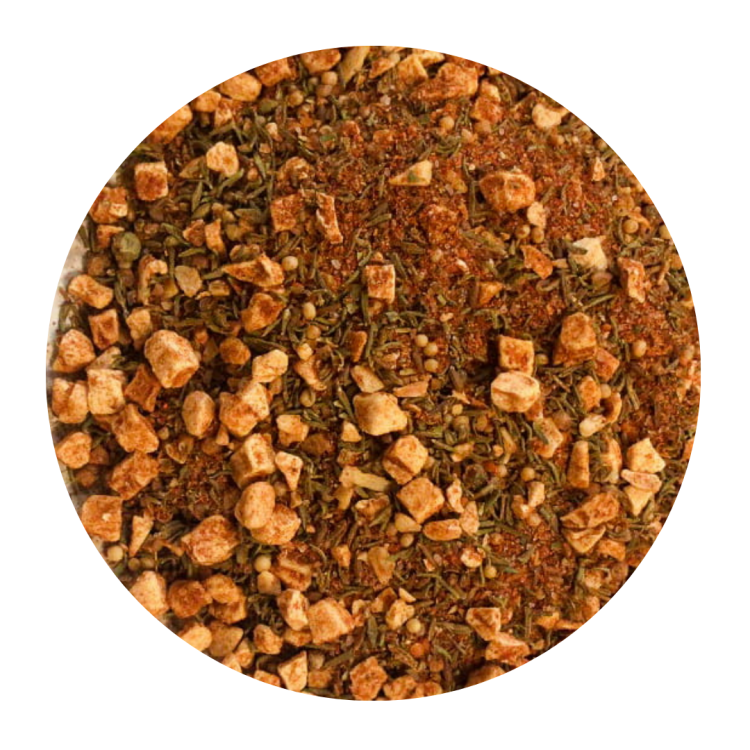 Połączenie słodkiej papryki, soli himalajskiej, aromatycznego czosnku i tymianku zyskało niecodzienny charakter dzięki dodatkom: pieprzu zielonego, kminu rzymskiego, gorczycy i liofilizowanego mango. To właśnie mango nadaje mieszance subtelnej słodyczy, która pięknie równoważy ostrość i ziołową głębię przypraw.