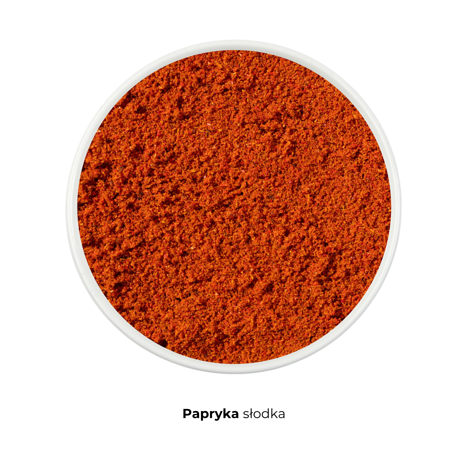 cebula, lubczyk, papryka słodka, kolendra, kminek, majeranek, pieprz czarny, koperek, kurkuma, czosnek, sól himalajska, bazylia.