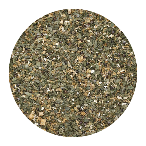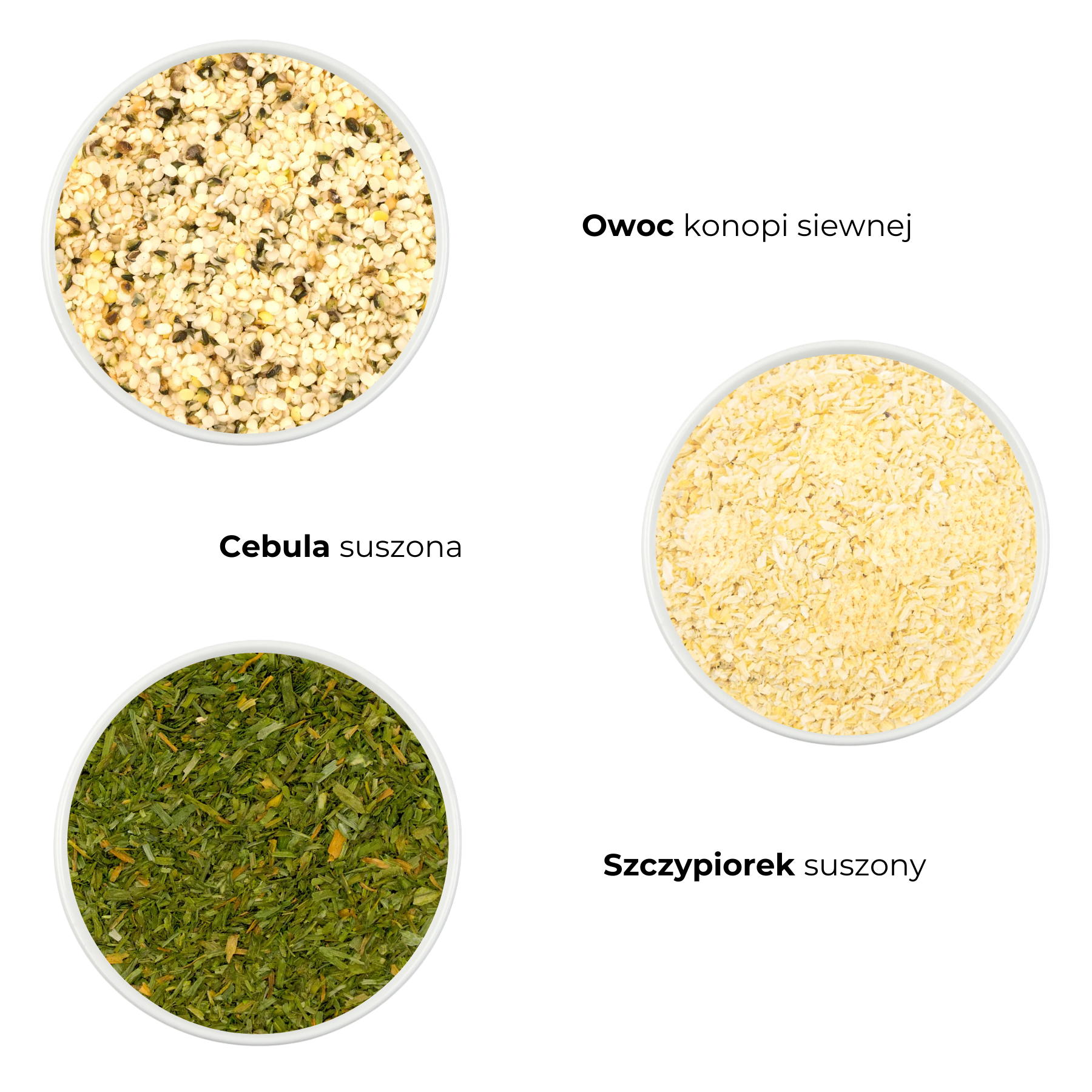 owoc konopi siewnej, cebula suszona, szczypiorek, natka pietruszki, seler suszony, sól himalajska, liofilizowane mango, papryka słodka, pieprz zielony, kminek, gałka muszkatołowa, kozieradka pospolita.