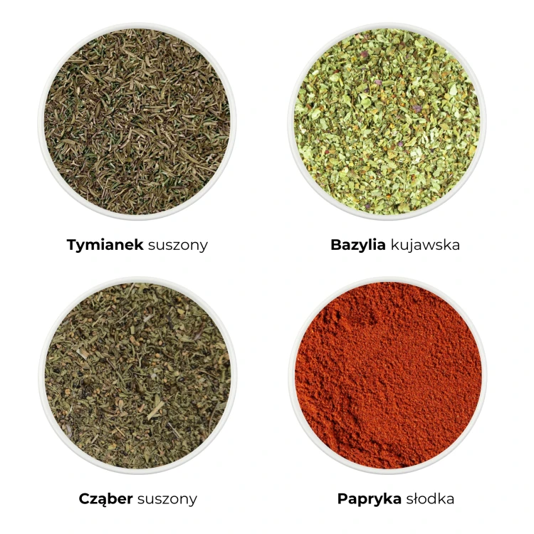 kolendra, gorczyca, kminek, majeranek, tymianek, bazylia, cząber, papryka słodka.
