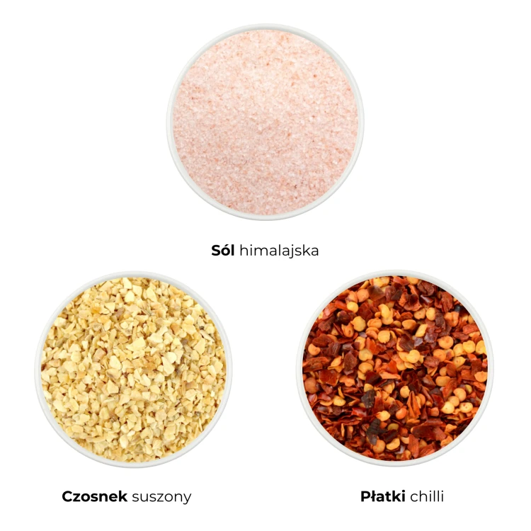 Sól himalajska z czosnkiem i chili to wyjątkowa mieszanka, która łączy trzy naturalne składniki w idealnych proporcjach. Zamknięta w małej szklanej fiolce (7 g) przyprawa sprawdzi się jako praktyczna próbka lub elegancki dodatek do zestawu kulinarnego.