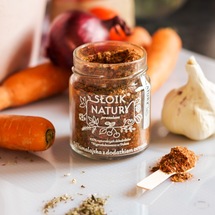 Przyprawa zamknięta jest w szklanym słoiku z zakrętką, który chroni mieszankę przed wilgocią i utratą aromatu. Dzięki szczelnemu zamknięciu przyprawa na długo zachowuje świeżość i intensywny zapach. To nie tylko praktyczne, ale także estetyczne rozwiązanie – słoik pięknie prezentuje się na półce kuchennej.