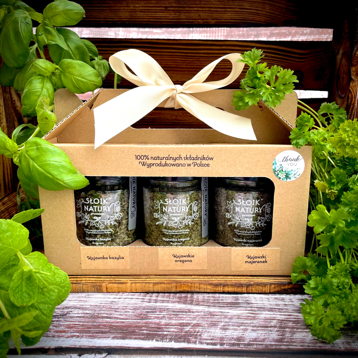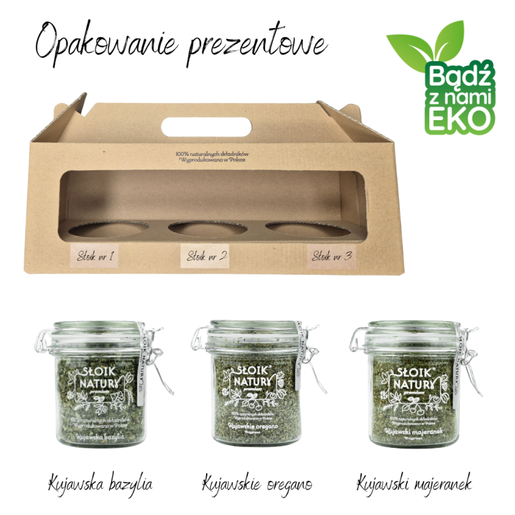 Zestaw 3 słoików z przyprawami - bazylia, majeranek, oregano + opakowanie prezentowe